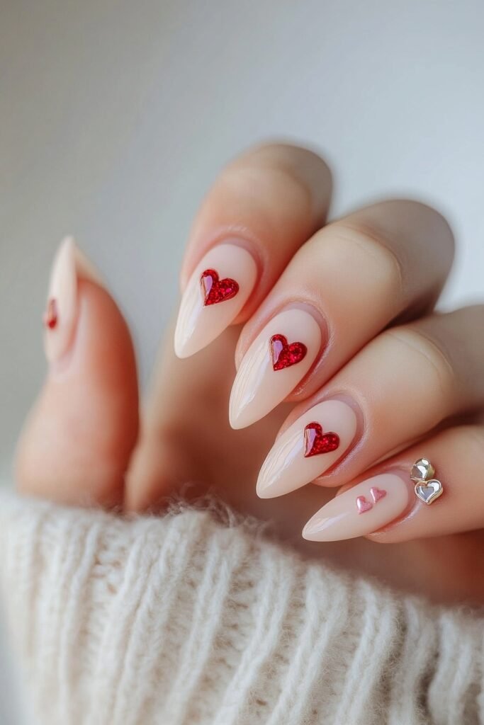 Soft nude almond nails with red glitter hearts and tiny 3D heart embellishments